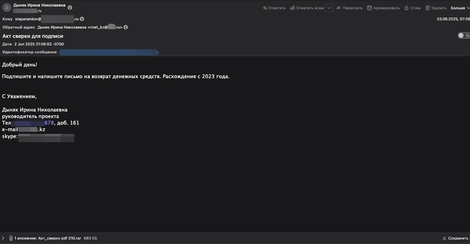Во вложении содержался архив с исполняемым файлом «Акт_сверки pdf 010.exe». Он представляет собой обфусцированный загрузчик, написанный на .NET, для распаковки и динамического исполнения второй стадии “MechMatrix Pro.dll”.