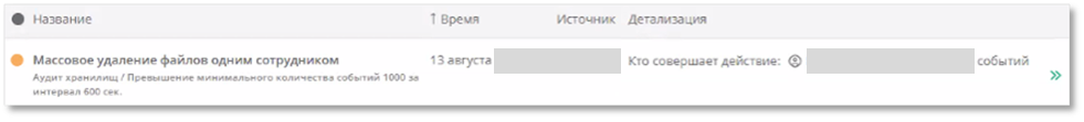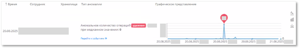 Пример резкого всплеска легитимной активности одного из пользователей с массовым удалением свыше 1 000 файлов за 10 минут: