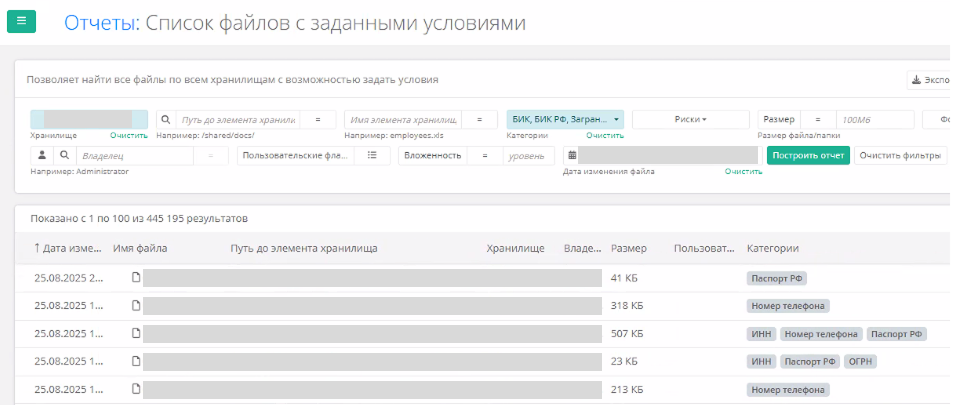Обнаружено 445 195 файлов, которые попадают под заданные правила классификации. Необходимо контролировать их расположение.